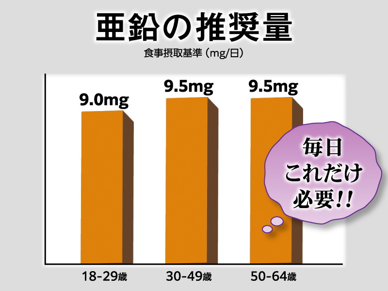 • 厚生労働省が発表している食事摂取基準(2025年版)によると、30〜64歳男性の毎日の推奨摂取量は9.5mg。