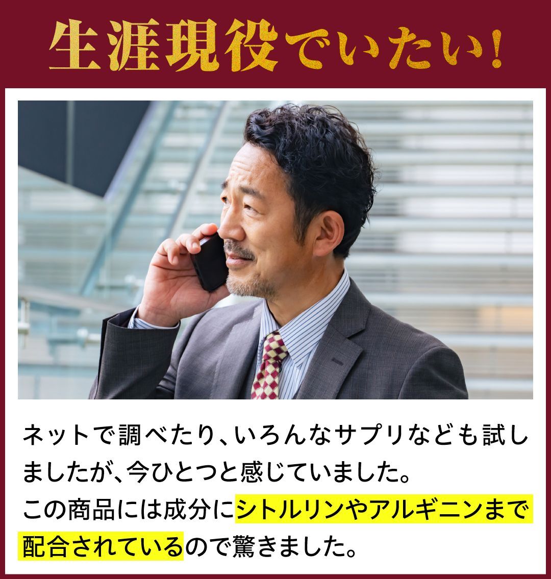 「アルギニン」は体内で合成できるアミノ酸の1種ですが、40代以降は合成量が減ってしまうんだとか…だからこそ、補うことが重要!エナジードリンクなどにも使用される活力成分!